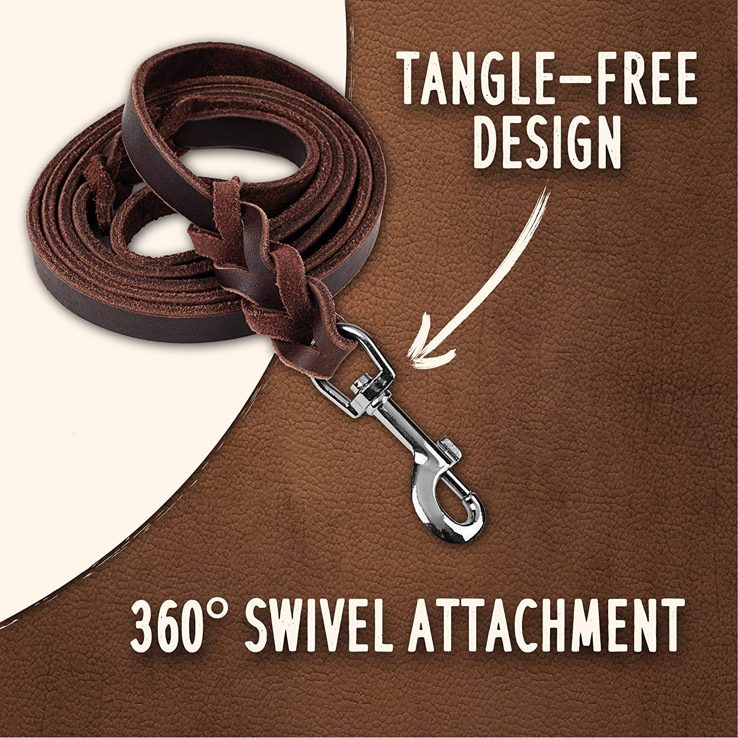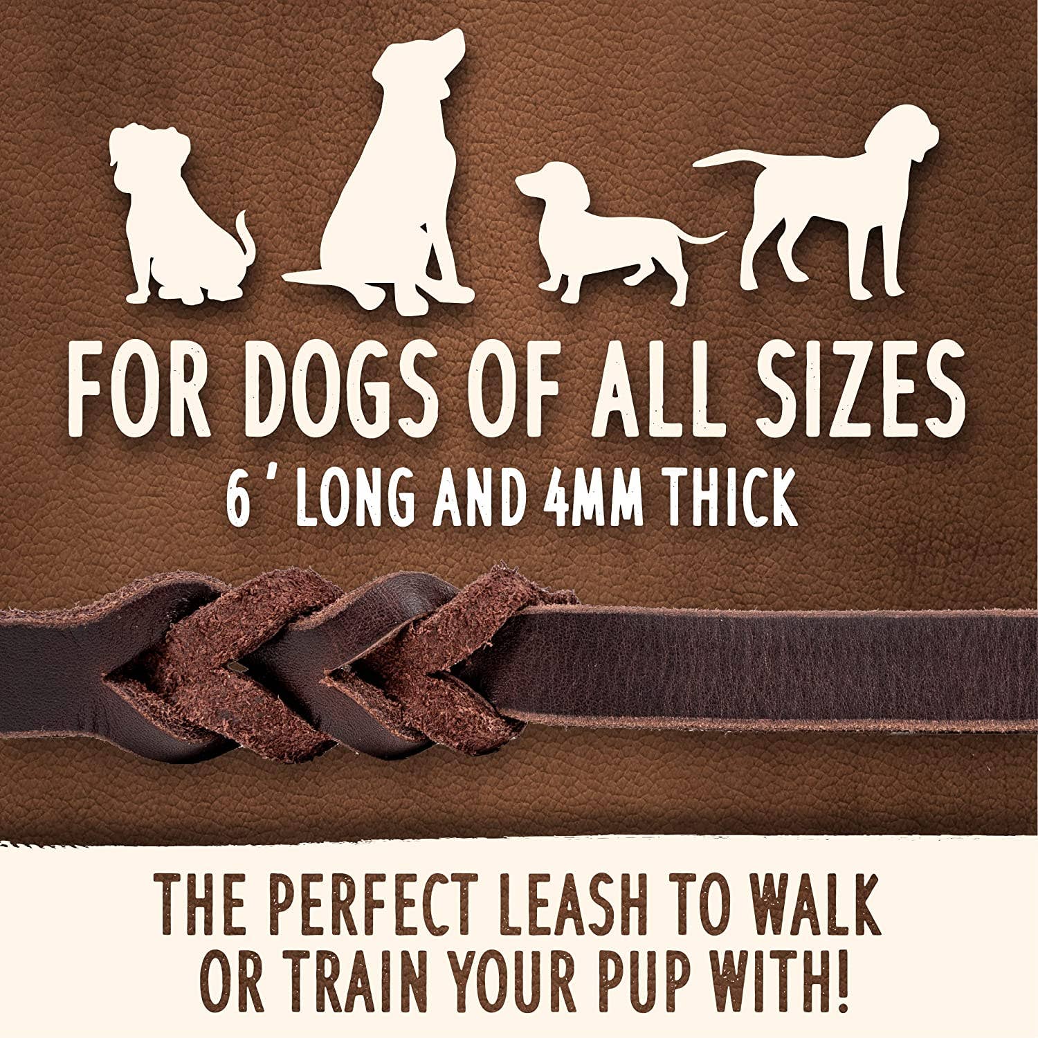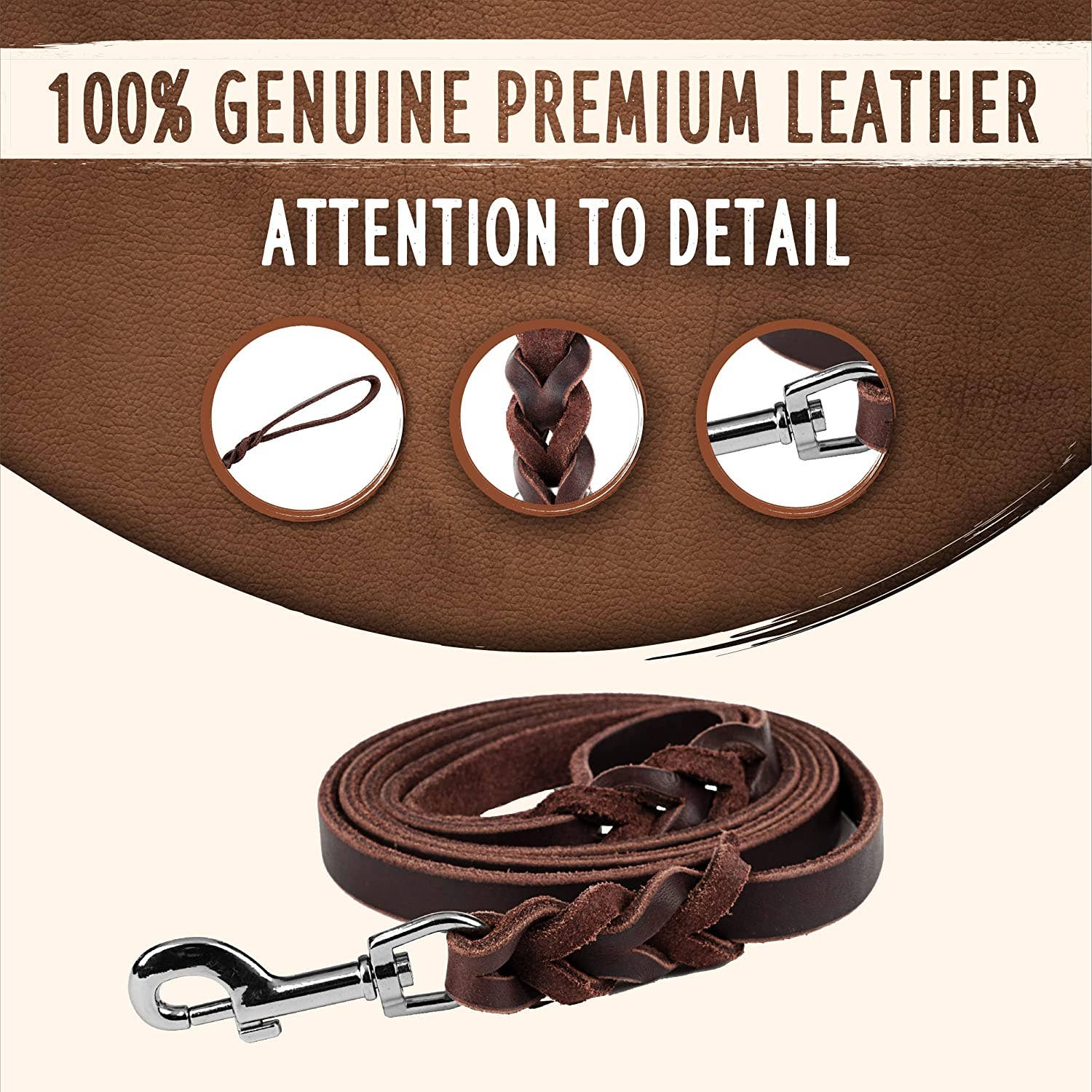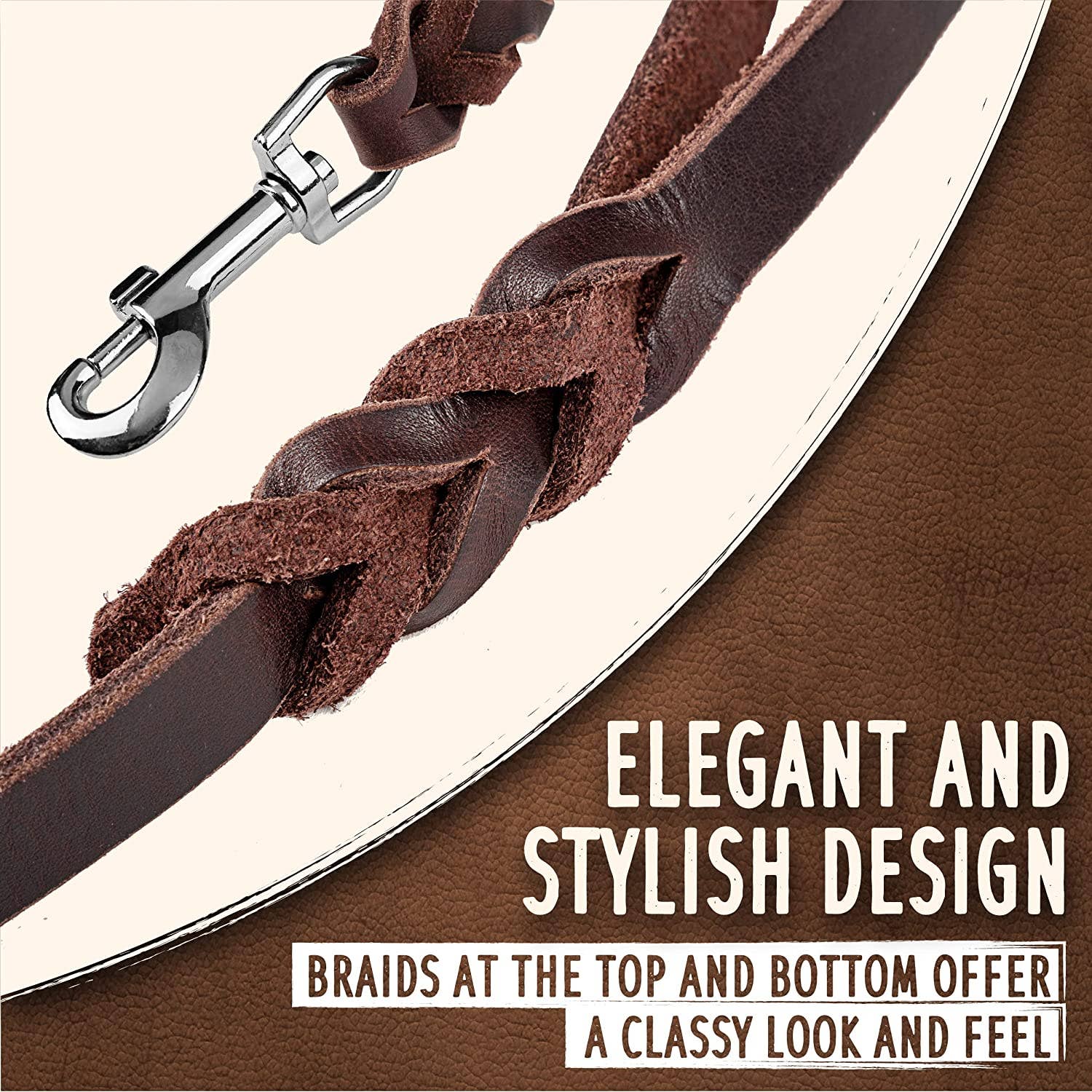 This leash is made with 100% flexible, genuine leather and strong hardware that will last you many years. The gorgeous braids at the top and on the bottom provide extra strength and can handle even the most playful dogs. Our standard version features a soft leather handle for grip stability and a metal clasp that withstands 385lbs of pulling force to control your active pup.