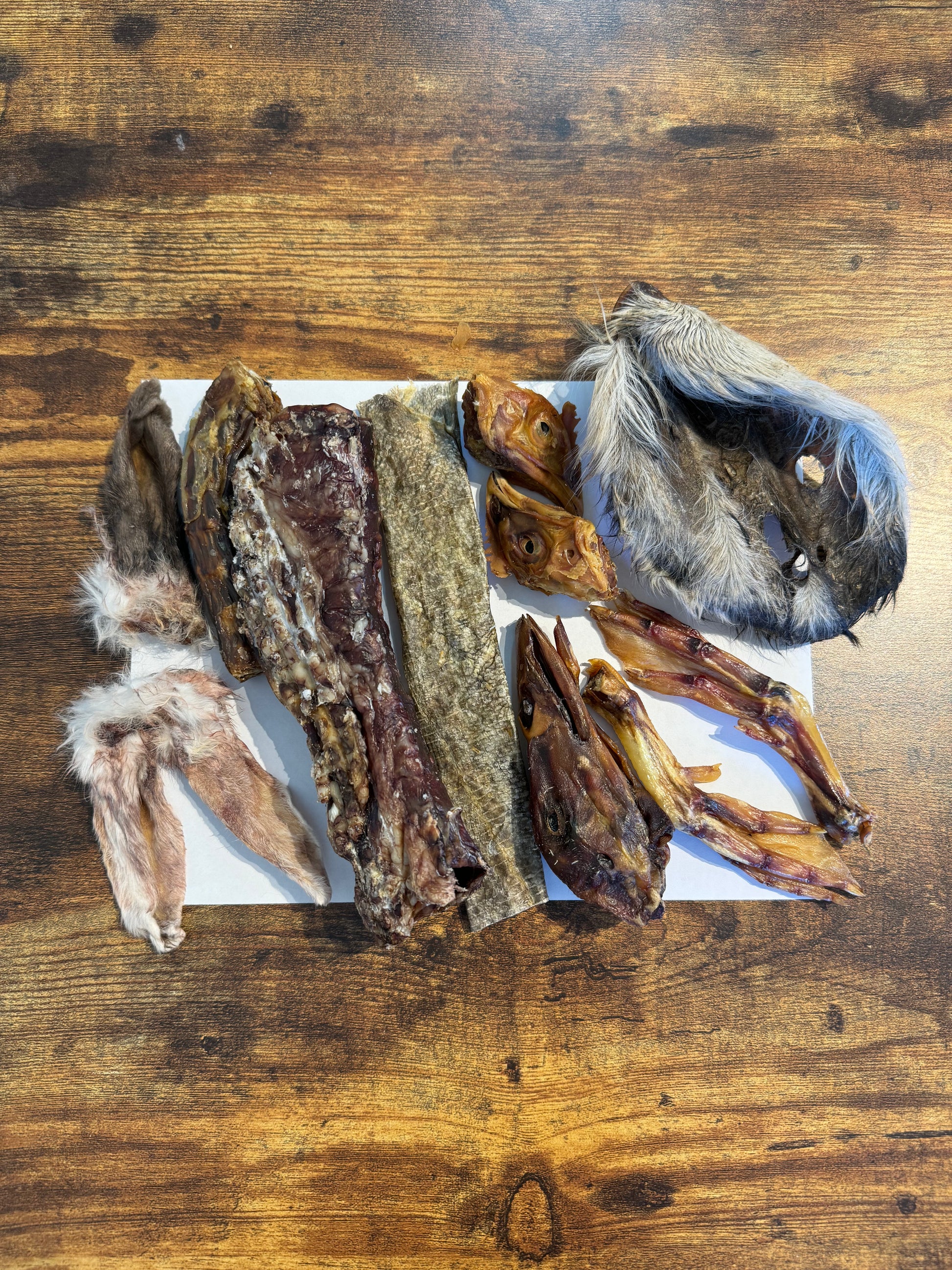 Chews may vary between each box- each box is a surprise variety of our products! This is a great way to find out what kinds of treats/chews your pup loves the most :) below we have listed the possible treats that may be one of the treats in your pup's box!