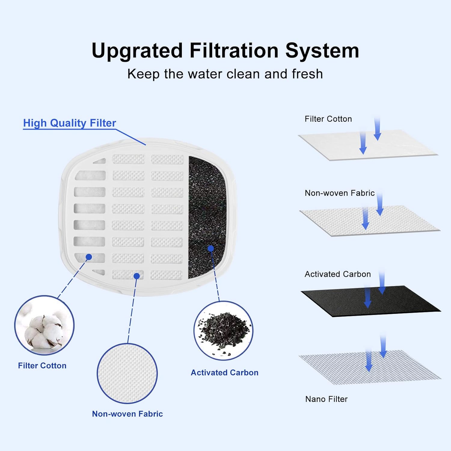 THREE-LAYER FILTRATION: includes one carbon nano filter, designed to last up to 6 weeks. ULTRA-QUIET: equipped with a special muffler to significantly reduce water noise.