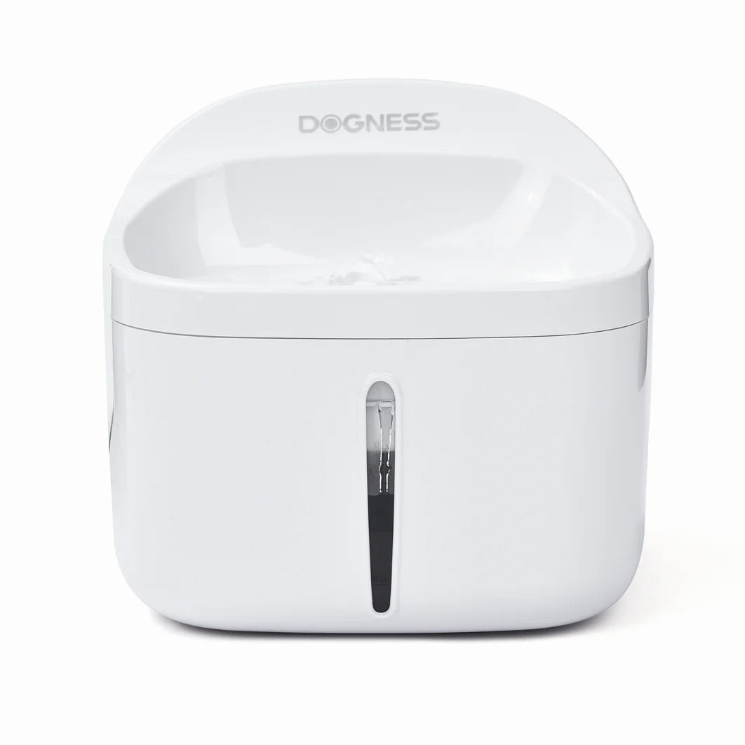 The Dogness Smart Fountain Plus holds up to 3.2 liters (almost 1 gallon) and the fountain-style continuously flows the water to aerate and reduce stagnation, while the built-in triple-layer filtration system ensures the water is fresh and odor-free. The ultra-quiet water pump is secured to the base of the tank by super-strong suction cups. The light illuminates the water level so you can clearly see when it's time to refill, but if you forget the light will change from blue to red as a visual reminder to replenish. The pump is designed to shut off if the water competently runs out to prevent it from overheating. It comes equipped with one replaceable filter that lasts up to 6 weeks of continuous use. Powered with an AC power adapter and 5’ft. Cord. BPA Free and cleans easily with dish soap and cloth or brush.