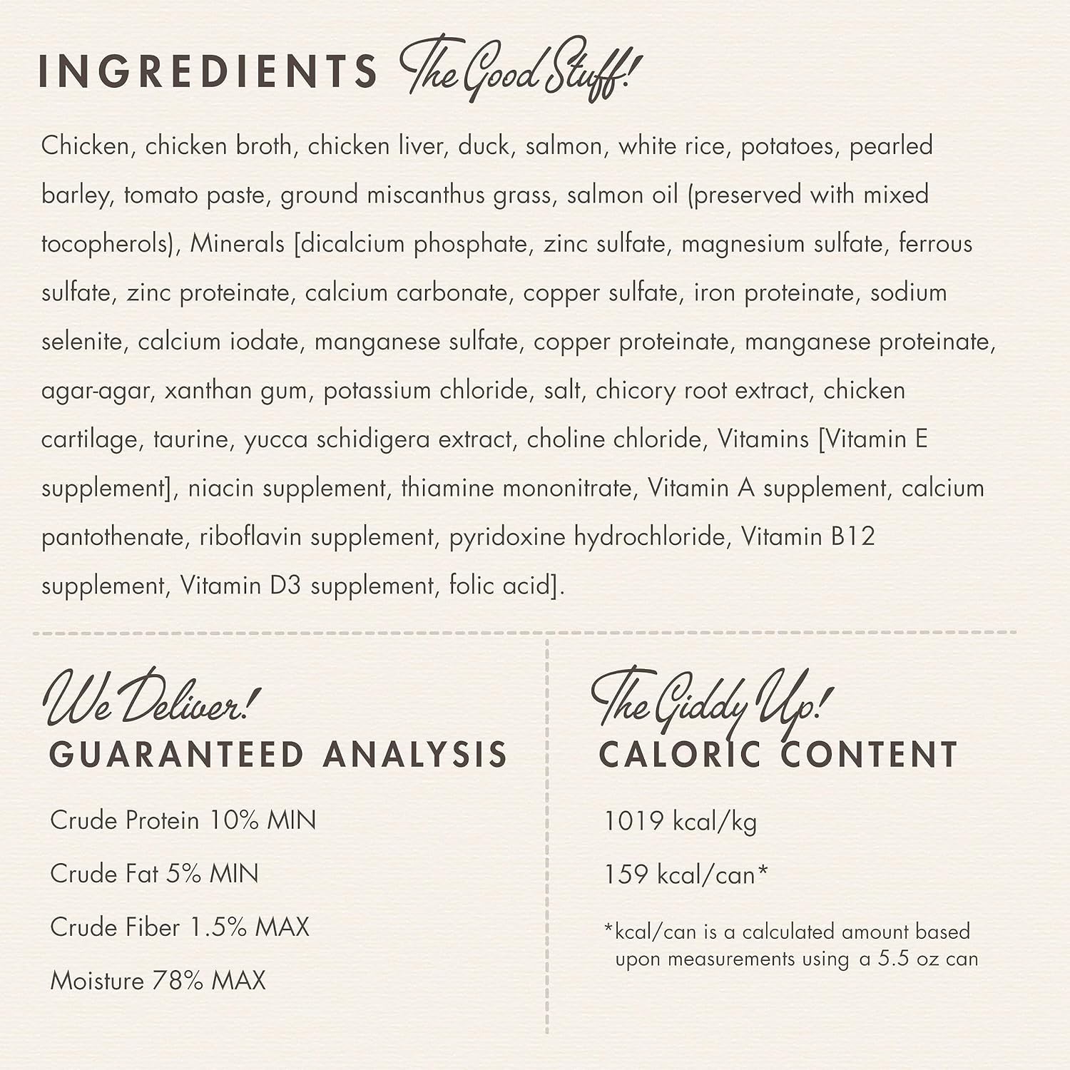 Ingredients-Chicken, chicken broth, chicken liver, duck, salmon, white rice, potatoes, pearled barley, tomato paste, ground miscanthus grass, salmon oil (preserved with mixed tocopherols), Minerals [dicalcium phosphate, zinc sulfate, magnesium sulfate, ferrous sulfate, zinc proteinate, calcium carbonate, copper sulfate, iron proteinate, sodium selenite, calcium iodate, manganese sulfate, copper proteinate, manganese proteinate], agar-agar, xanthan gum, potassium chloride, salt, chicory root extract, chicken cartilage, taurine, yucca schidigera extract, choline chloride, Vitamins [Vitamin E supplement, niacin supplement, thiamine mononitrate, Vitamin A supplement, calcium pantothenate, riboflavin supplement, pyridoxine hydrochloride, Vitamin B12 supplement, Vitamin D3 supplement, folic acid].