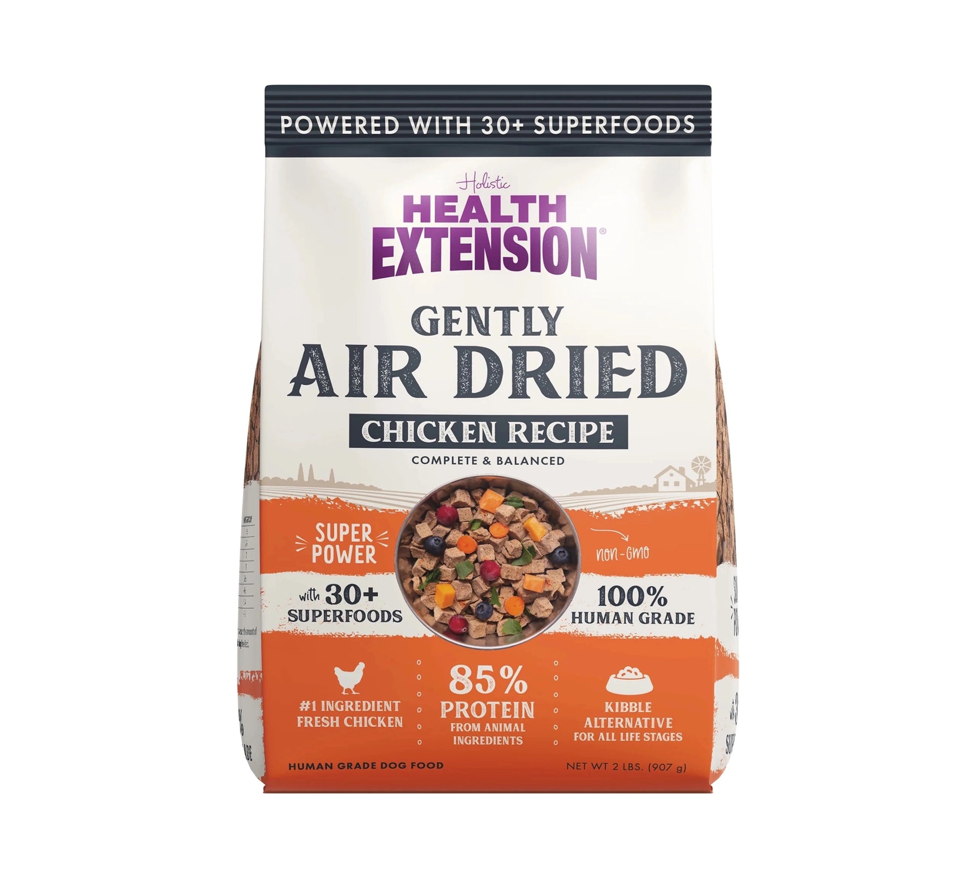 Health Extension Gently Air Dried Complete dog food is a convenient and cost effective alternative to homemade, frozen, and freeze-dried raw foods. These small-batch, complete and balanced recipes contain up to 85% protein from animal sources and powered with 30+ superfoods to boost immunity, including organic apple cider vinegar, turmeric, colostrum, lion’s mane mushroom, goji berry and coconut oil. Gently Air Dried is made with fresh human-grade ingredients starting with chicken, beef, or salmon and nutrient-packed vegetables such as pumpkin, carrots, and sweet potatoes. For all life stages.