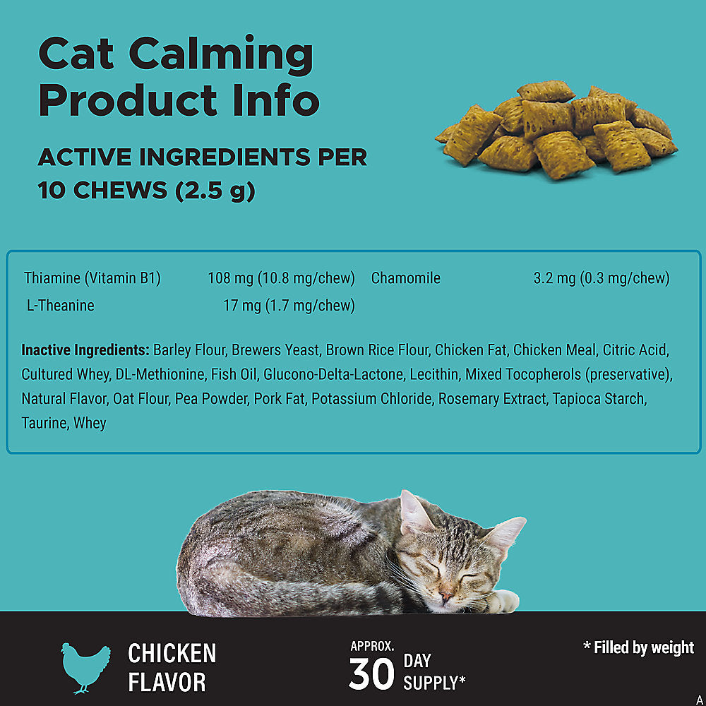 Thiamine (Vitamin B1), L-Theanine, Chamomile, Barely Flour, Brewer's Yeast, Brown Rice Flour, Chicken Fat, Chicken Meal, Citric Acid, Cultured Whey, DL-Methionine, Fish Oil, Glucono-Delta-Lactone, Lecithin, Mixed Tocopherols (preservative), Natural Flavor, Oat Flour, Pea Powder, Pork Fat, Potassium Chloride, Rosemary Extract, Tapioca Starch, Taurine, Whey