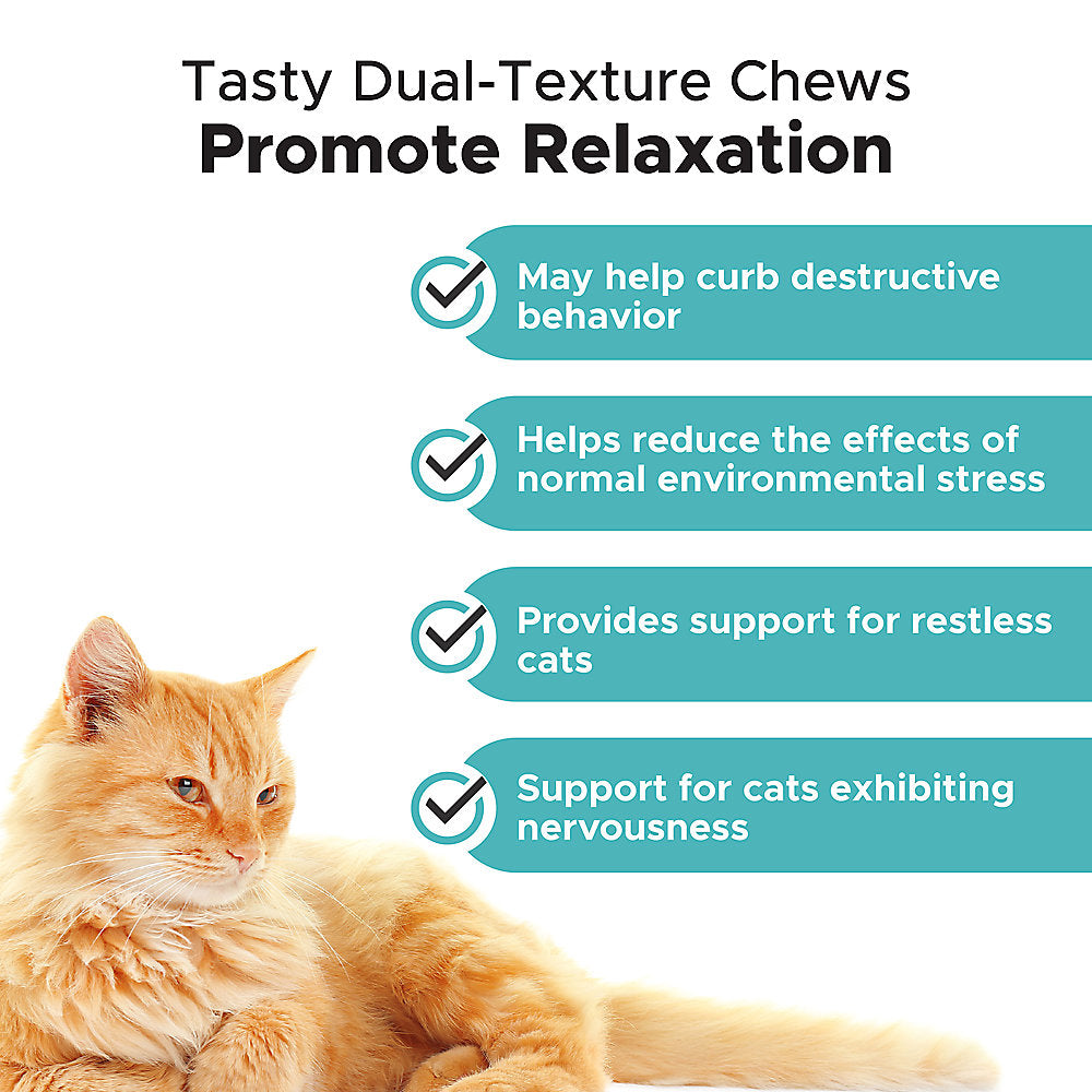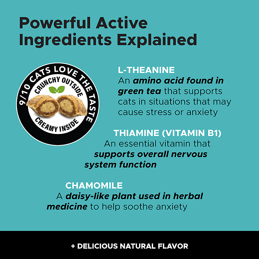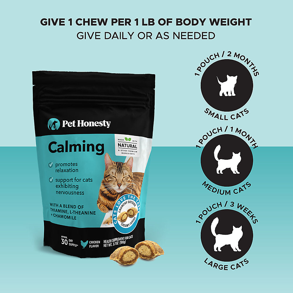 Pet Honesty's Calming dual-texture cat chews have a delicious crunchy shell with a creamy filling your cat will love. Our unique formulation delivers powerful amino acids Thiamine and L-Theanine, and natural Chamomile to provide support in situations that may cause stress or anxiety and help your cat maintain a normal disposition. Pet Honesty's Calming dual-texture cat chews are delicious and easy to give, soothing your cat (and you) in the process.