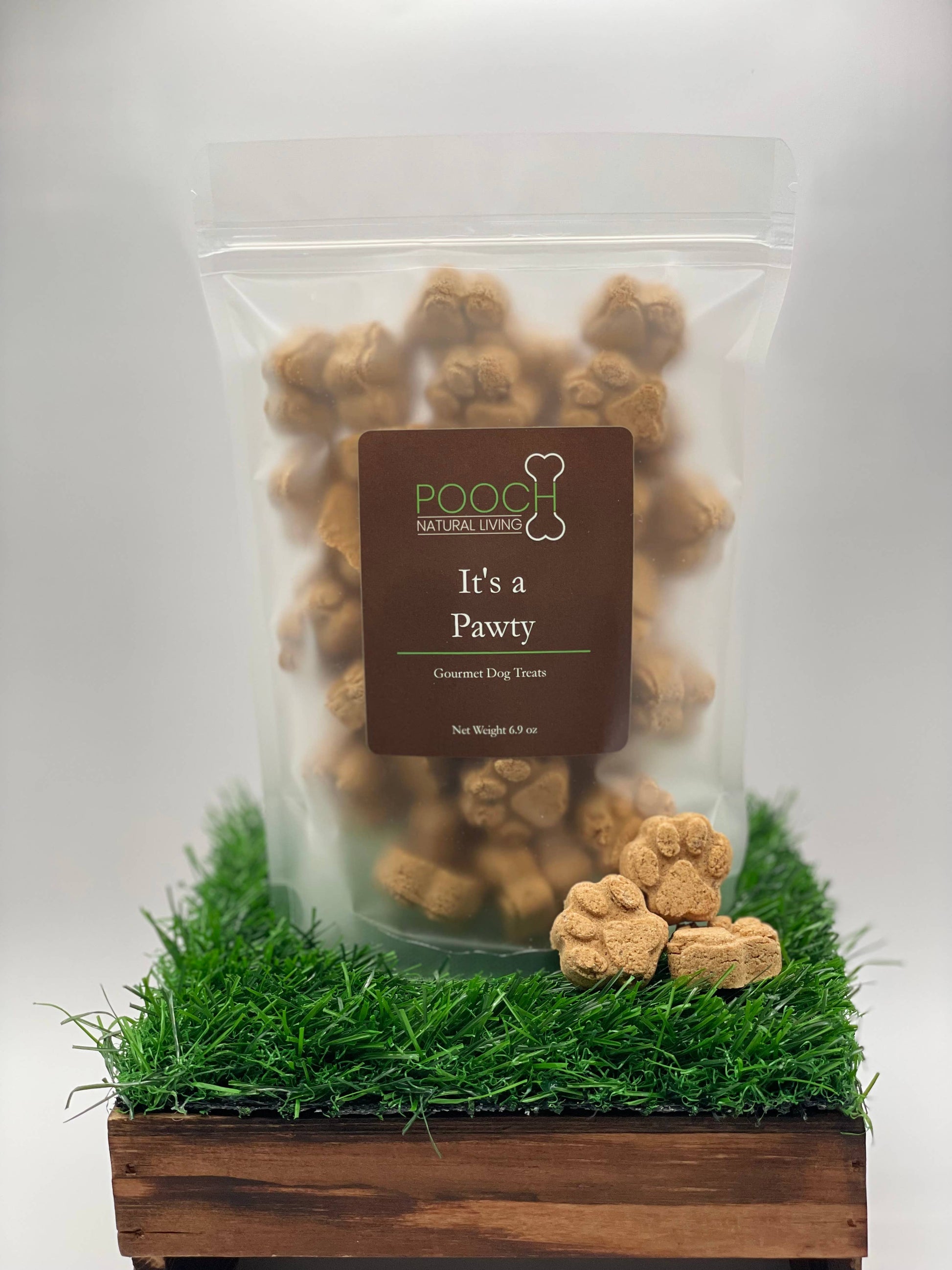 It's a Pawty is about 3/4" inch sized crunchy treat (60 count) shaped as a paw. The paw shaped treat is made of peanut butter, molasses, non-dairy coconut yogurt, chia seeds, and coconut oil. This will be a treat to pawty about!