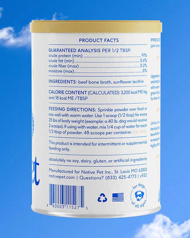 Upgrade your dog’s dried kibble with this super-nutritious and totally delicious Beef Bone Broth Powder. Combined with water, it re-hydrates their food with a little bit of grass-fed goodness.