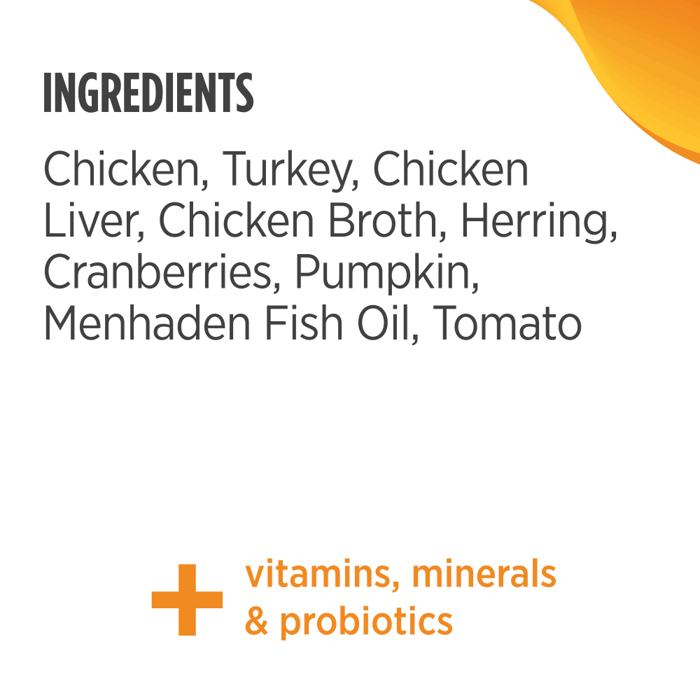 Ingredients & Analysis- Chicken, Turkey, Chicken Liver, Chicken Broth, Herring, Natural Flavor, Guar Gum, Potassium Chloride, Agar-Agar, Choline Chloride, Taurine, Cranberries, Pumpkin, Menhaden Fish Oil (Preserved With Mixed Tocopherols), Tomato, Dried Kelp, Yucca Schidigera Extract, Salt, Thiamine Mononitrate, Sodium Carbonate, Iron Proteinate, Zinc Proteinate, Vitamin E Supplement, Magnesium Sulfate, Copper Proteinate, Manganese Proteinate, Sodium Selenite, Niacin Supplement, d-Calcium Pantothenate, Pyridoxine Hydrochloride, Riboflavin Supplement, Vitamin A Supplement, Biotin, Potassium Iodide, Vitamin D3 Supplement, Vitamin B12 Supplement, Folic Acid, Rosemary Extract.