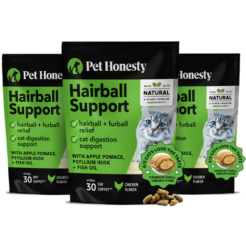 Pet Honesty’s Hairball Support is a delicious, dual-textured supplement that helps promote the removal of hairballs and support skin health. Powerful ingredients like Apple Pomace, Zinc, and Psyllium Husk support digestion and skin health to promote hairball removal while helping future ones from forming.