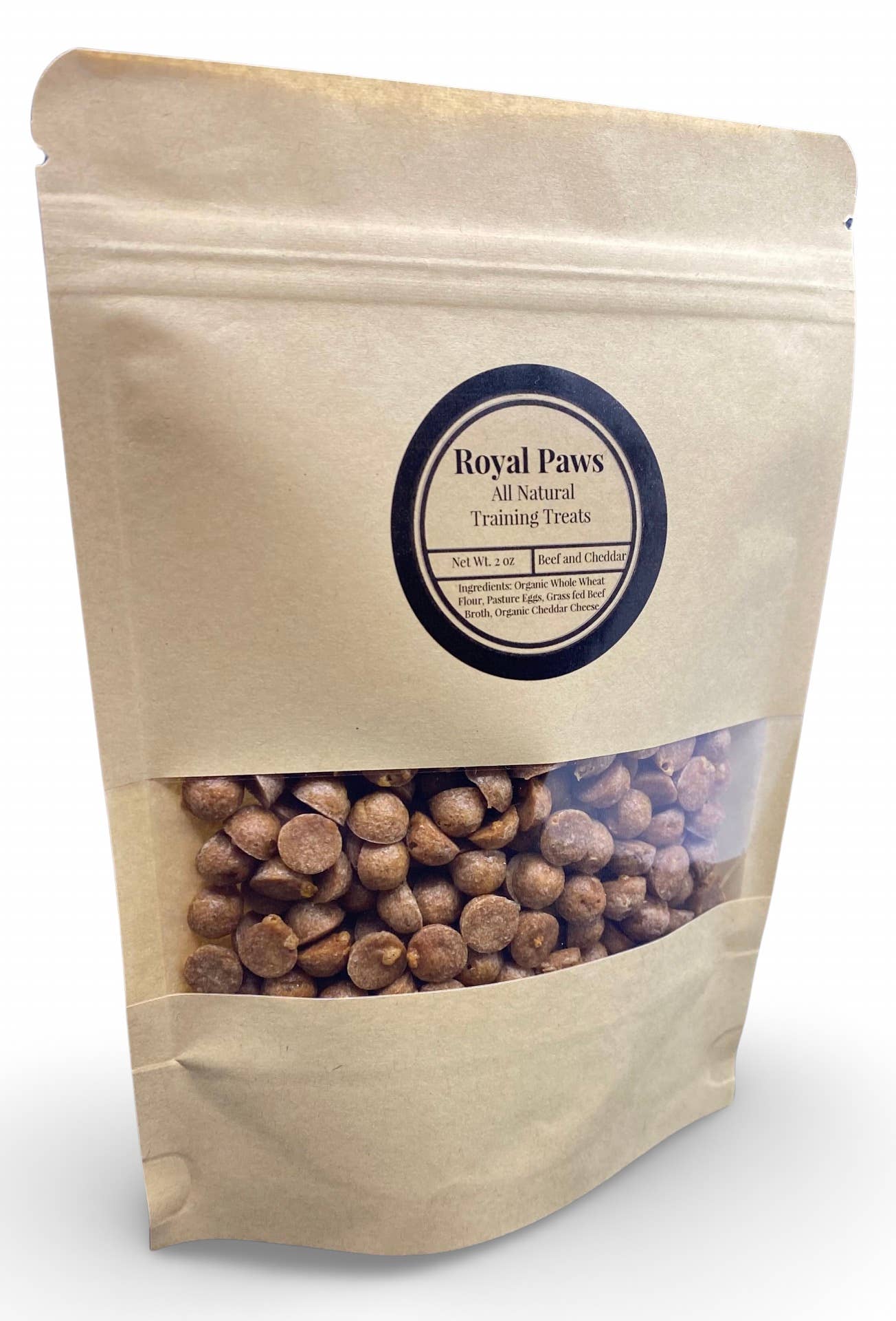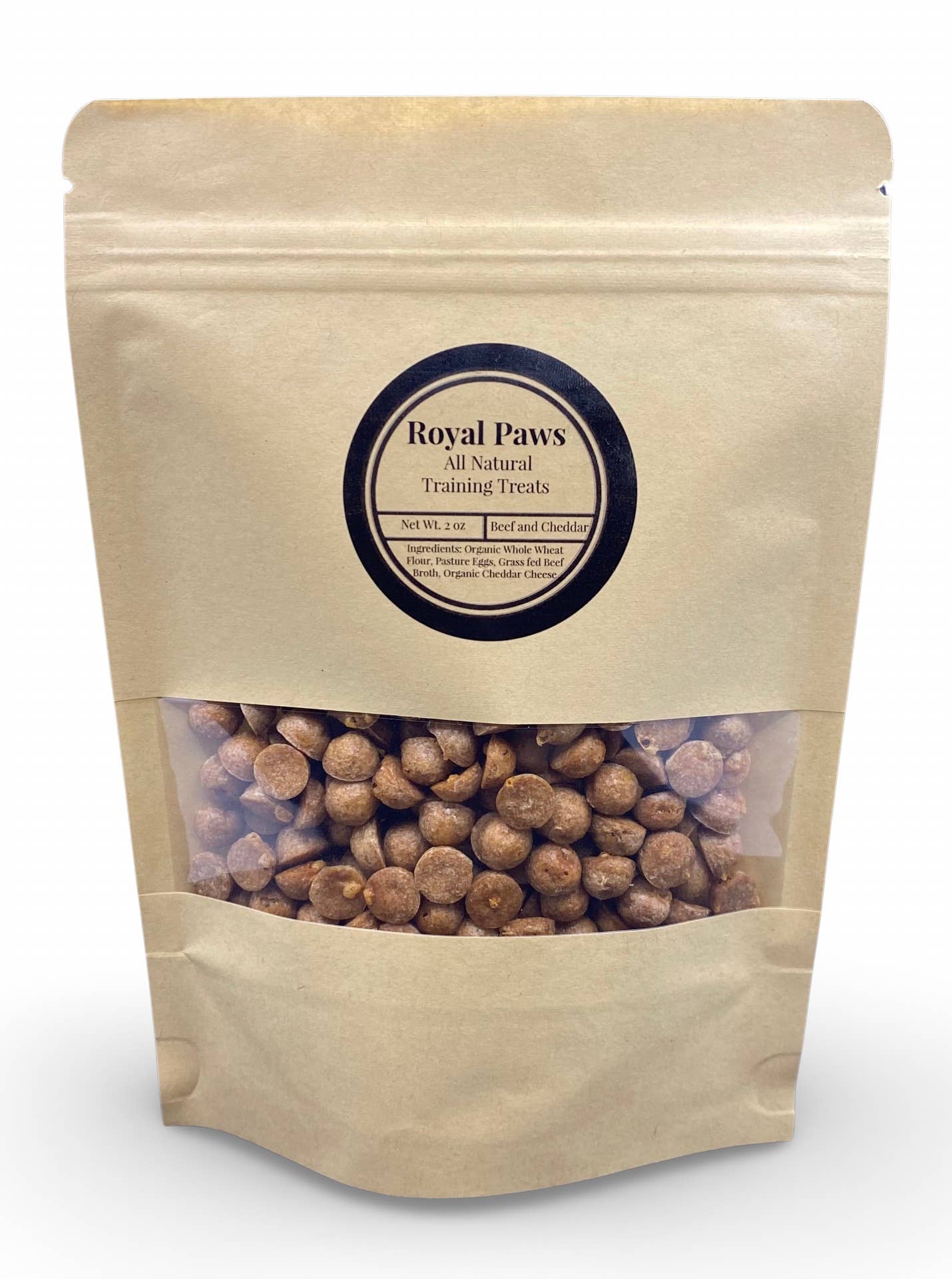 Super delicious, all natural Beef and Cheddar Training Treats. Made with Organic whole wheat flour, pasture eggs, grass fed beef broth and organic cheddar cheese. 2oz pouch